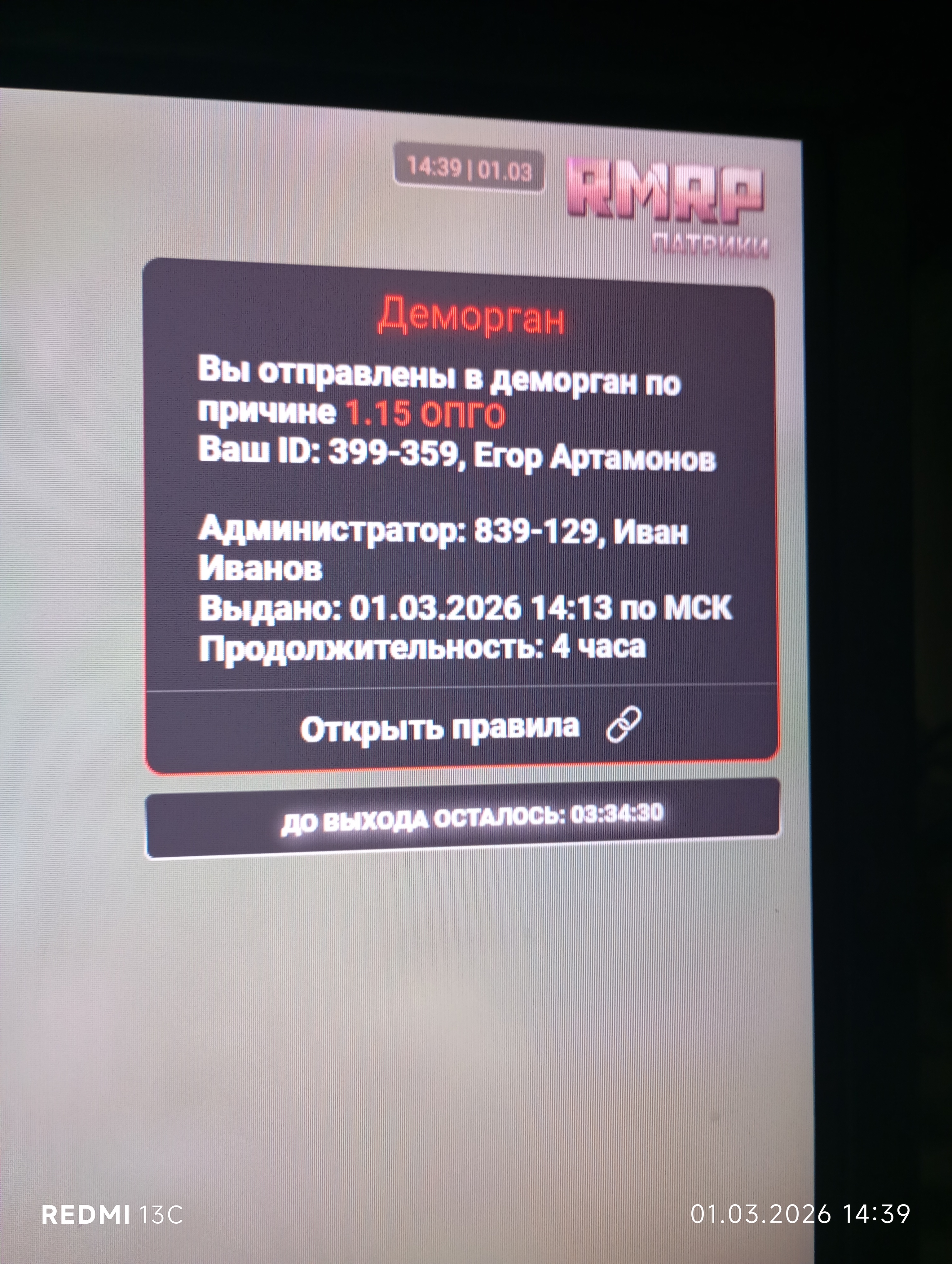 - Скриншот наказания