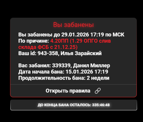 - Месяц назад когда был в ФСБ не знал что нельзя брать с собой накопленные оружия и бронежилеты, после чего забрал их в багажник ЛТС за что извиняюсь. Сейчас стою на Вице Президенте Адвокатской Палаты и хотел бы получить хотя бы минимальную амнистию чтобы мой состав не стоял без контроля. Каюсь за свое нарушение и прошу снять срок блокировки, если возможно могу дать компенсацию. Заработал я на тот момент примерно 4 миллиона, так как по незнанке думал что все выданное мне оружие можно оставить себе. Это мое первое нарушение по этому пункту, не знал что так делать нельзя и никогда с таким не сталкивался, прошу простить и амнистировать меня на сколько это возможно. Надеюсь на ваше понимание! Спасибо за уделенное внимание.