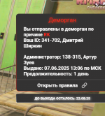 Доброго времени суток дорогая администрация. Хочу попросить вас о амнистии в сторону моего наказания. Я признаю свою вину в нарушении правил проекта, также я внимательно просмотрел и запомнил правила данного проекта и впреть обещаю соблюдать их. После получения наказания по случайному стечению обстоятельств я оказался в психиатрической больнице и провел там 2 месяца, в данный момент я нахожусь на терапии и имею не так много свободного времени для того чтобы отсидеть срок. Прошу вас проявить милосердие и доверие, а также заранее благодарю и желаю хорошего настроения!
