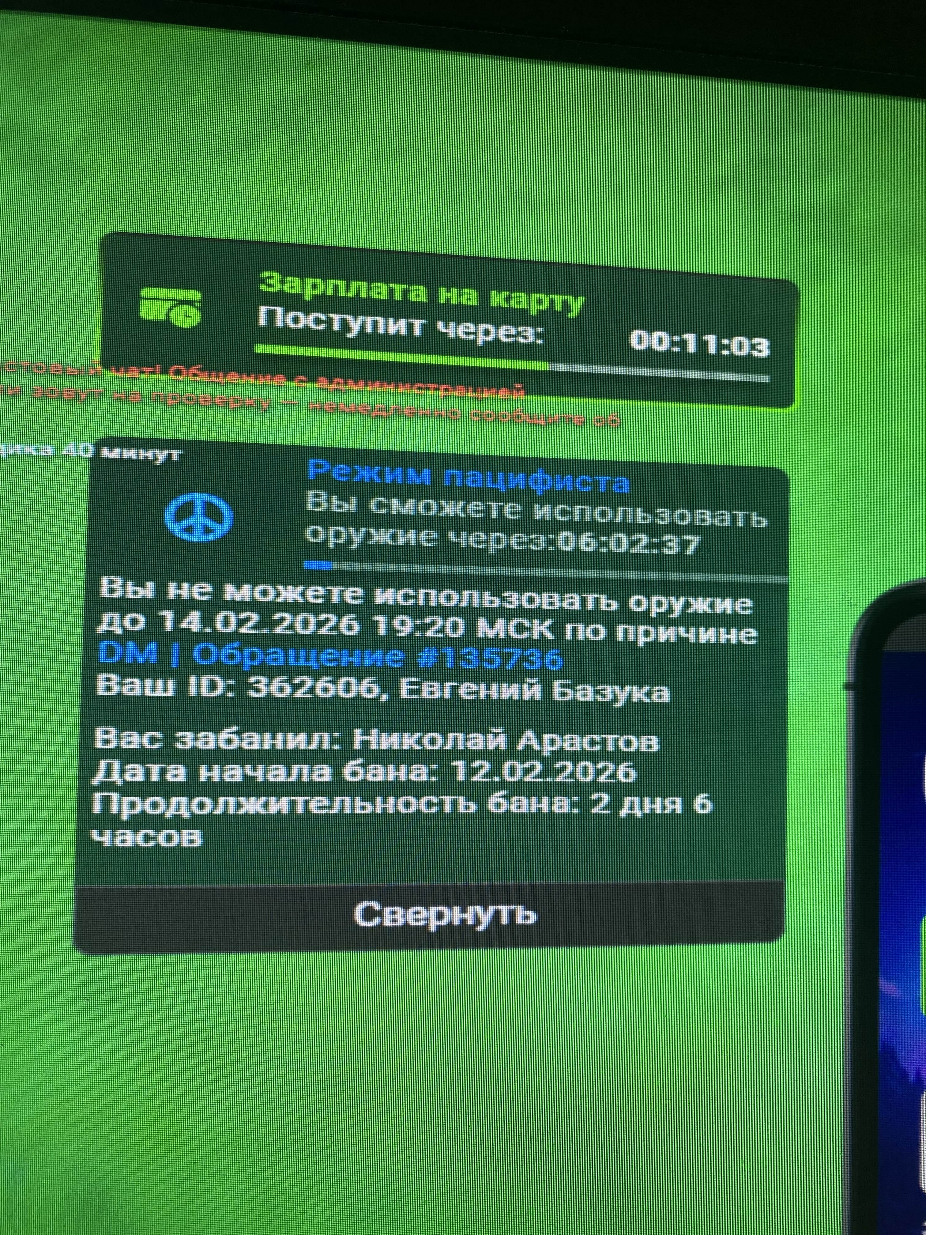 - Убил сотрудника во время крупной перестрелки с гос структурами, увидел что человек в бронежилете и подумал что представляет опасность только после выдачи наказания Оказалось что таким не является. Искренне прошу прощение 9 РАЗ КЛЯНУСЬ ЧТО БОЛЬШЕ ТАКОГО НЕ БУДЕТ честно не обратил внимание что у игрока не было гана в руках((((((