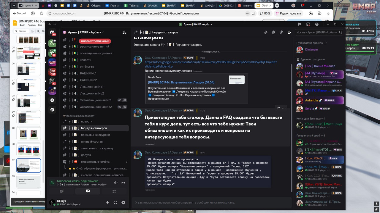 Отдельно отмечаю действия заместителя комиссара А. Урагана. За два дня он не выполнил никаких существенных задач, ограничившись созданием FAQ для стажёров, в котором используется устаревшая вступительная лекция с упоминанием бывшего лидера армии Зодорожного. Указанная лекция была создана ещё 01.04.2025, что свидетельствует не о работе, а о формальном копировании старых материалов без актуализации и самостоятельного вклада.
